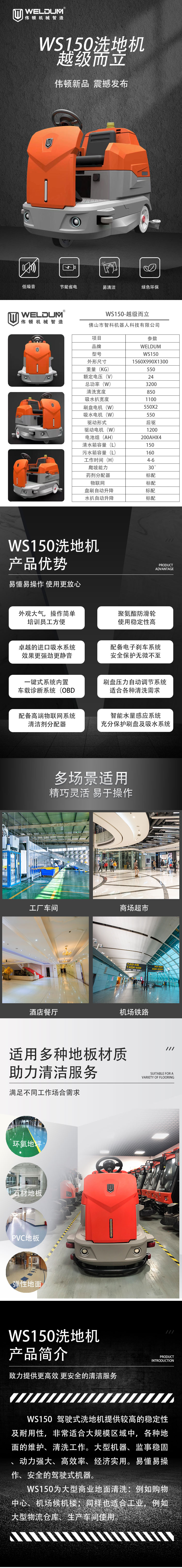 WS150駕駛式洗地機(jī)提供較高的穩(wěn)定性及耐用性,非常適合大規(guī)模區(qū)域中,各種地面的維護(hù)、清洗工作。大型機(jī)器、監(jiān)事穩(wěn)固、動力強(qiáng)大、高效率、經(jīng)濟(jì)實(shí)用。易懂易操作、安全的駕駛式機(jī)器。。